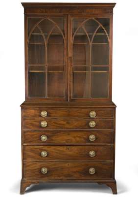 the moulded cornice above a pair of arched astragal glazed doors enclosing adjustable shelves, the lower section with a full front double drawer enclosing a satinwood veneered fitted interior, with three further long graduated drawers, on splayed bracket feet