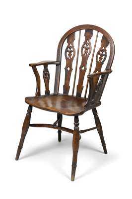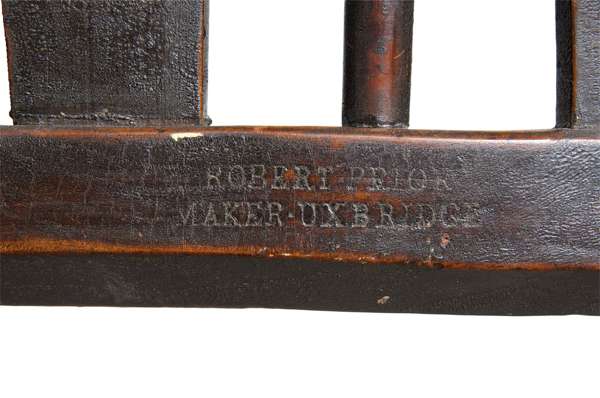 Robert Prior (1780-1853) was of the second generation of the Prior Family of Uxbridge, Middlesex. The Priors are synonymous with quality Windsor chair making and Robert Prior, who took over the running of the company from his father, is the most celebrated of the six family chair makers. The use of quality woods, bell shaped seats, and triple splats in two lengths to fit the back hoop are all characteristics of their chairs. For a detailed discussion of the Prior Family dynasty and for an illustration of this particular model, as well as other examples of chairs stamped or attributed to this workshop see Dr. B. Cotton ' The English Regional Chair ', Woodbridge, 1990, pages 36/76-80, plate 33.