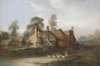 A GOOSE GIRL WITH HER FLOCK BEFORE THATCHED COTTAGES