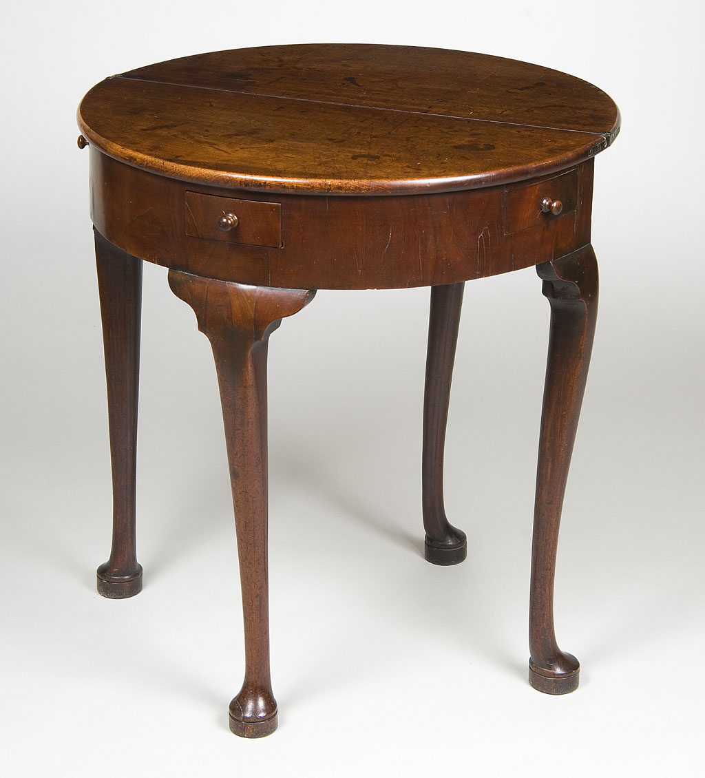 the fold over top above three small frieze drawers, on cabriole legs and pad feet