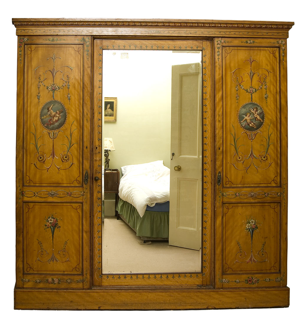 A Victorian painted satinwood wardrobe, retailed by James Shoolbred & Co., circa 1890