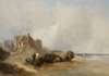 FIGURES AND BOATS IN THE SHALLOWS BEFORE A COASTAL VILLAGE