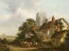 FIGURES WITH DONKEY CART BEFORE COTTAGES AND CHURCH
