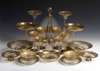 each piece with a gilt and black stylised lotus band above diamond facets, the stems of hexagonal baluster form with further lotus on the spreading base, comprising; 11stemmed water glasses 11 red wine glasses, 10 white wine glasses, 6 liqueur glasses, 9 fingerbowls, 7 stands, a pair of bonbon dishes, a pair of footed dishes, a pair of dishes with gilt bands, 3 cups with gilt handles and a saucer, a pair of footed and lobed bowls, 4 candlesticks with faceted columns, 2 tall stemmed fruit bowls, 2 claret jugs and a decanter with stopper