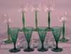 each with a slender green baluster stem, the bowl wheel cut with geometric motif (18cm) together with 7 green wine glasses of conical form (14cm)