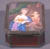 late 19th century, the cover painted in enamel with a young woman leaning against a column with a cupid seated and holding his bow, the base and side panels mounted in silver ripple border