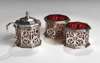 of octagonal pierced bodies, engraved with deer's head and arrow crest, with ruby glass liners