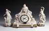 second half of the 19th century, the clock in a rustic case with a figure of Diana and a hound; the side pieces being figures of Bacchus and Venus with armorino and dryad, the enamel dial signed 'Julien' (some damage) (3)
