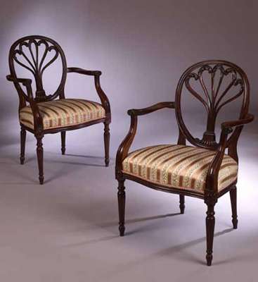 with almost oval backs, carved feather splats and paterae to the arm terminals, overstuffed seats, on turned fluted supports (some damages) (10)