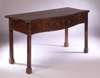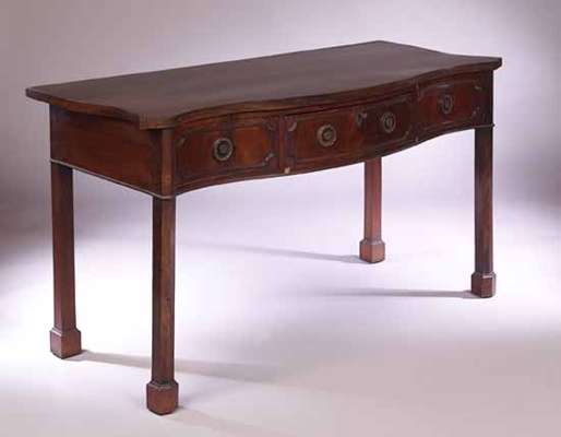 incorporating earlier elements, the serpentine fronts fitted with three frieze drawers with brass furnishings, on square chamfered block supports, with plate glass tops, bearing the label 'S & H Jewell, 131