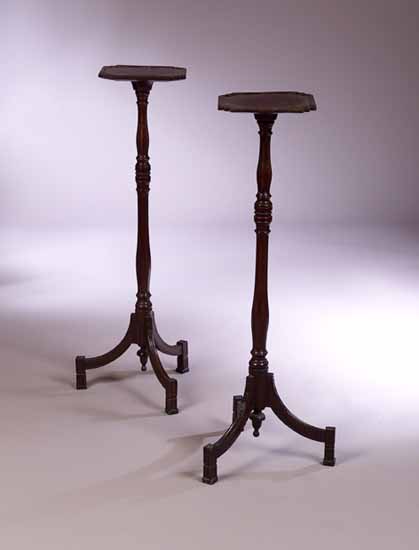 the square tops with cut away corners, on fluted and carved columns to the tripod supports with peg feet having lead weighted bases (2)