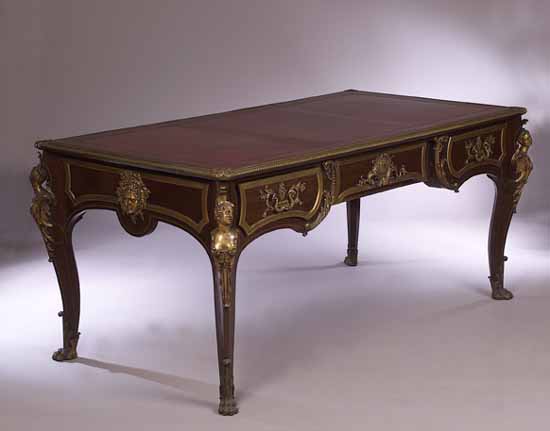 of kingwood with brass inlay and chased ormolu mounts, tooled red leather top, fitted three frieze drawers, ovolo brass nosing, the supports with caryatids and lion claw feet