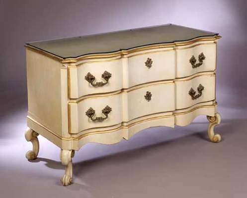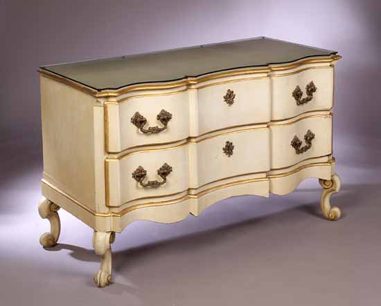 18th century and later, serpentine fronts fitted two serpentine drawers with heavy brass furnishings, on scroll supports, in ivory painted and gilt finish, with plate glass tops (2)