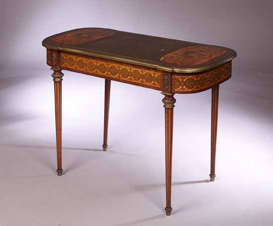 circa 1900, with exotic wood inlay, the tooled leather top flanked by D end marquetry panels above a frieze drawer and gilt bronze mounts