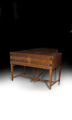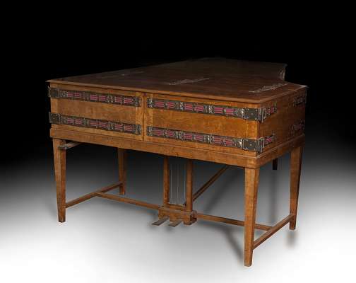 Note: The Broadwood Piano Co records state that this piano was finished by 12th March 1904 and delivered to Hitchingbrooke on 29th March of the same year. Ashbee's deliberately unconventional style around this time particularly focussed on his designs for pianos. Both his wife and his mother were talented pianists and besides, 'artists and architects of advanced tastes had been interested in reforming the design of piano cases for some time'. Burne-Jones with W.A.S. Benson had produced a design in 1879 which replaced the deep curves and massive legs of the high Victorian era with a treatment closer to late 18th century harpsichords and these 'Reformed' or 'Artistic' forms provoked 'steady interest' from then onwards. Ashbee's first design was for his wife Janet in 1900 and was 'shocking' in its subversion of convention. As in the present example the cabinet work was carried out by Broadwood & Co. and the heavy cast hinges were made by the Guild of Handicrafts. The form was square and reflected the piano forms of the late 18th century but with hinged doors to the front. This example, produced four years later retains many of the features of this original design with the case enclosing the more usual grand piano frame. These 'specials', as they were known at Broadwoods, were made to commission and were bespoke for each client.