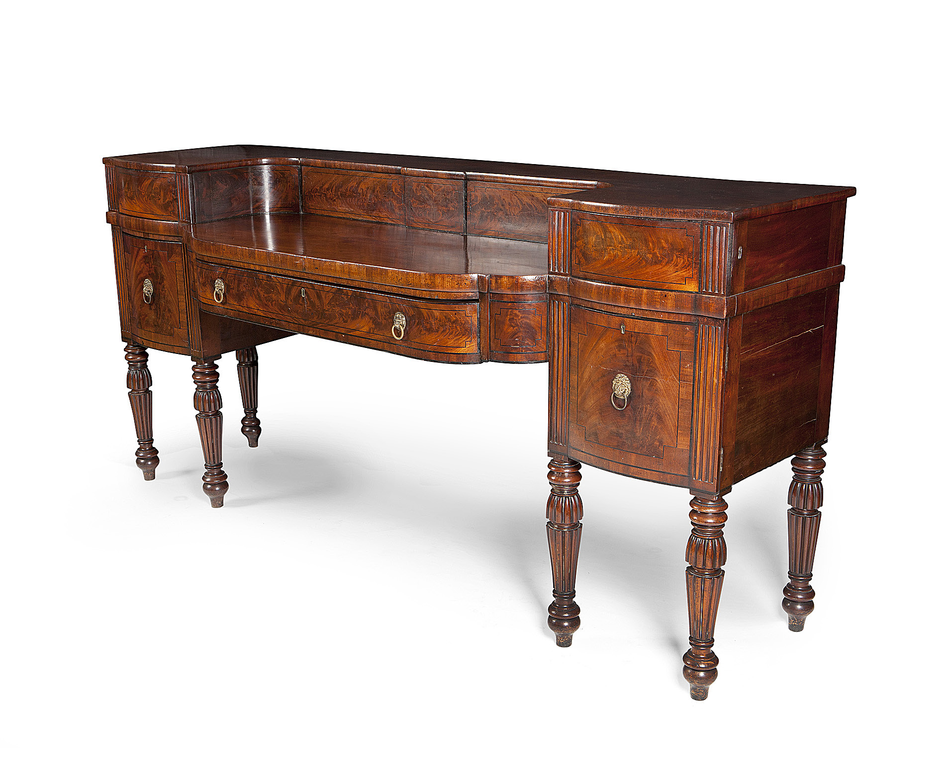 the top with galleried superstructure flanked with two projecting drawers, above a central bowed drawer flanked by a cellaret drawer and cupboard between reeded stiles, raised on turned and reeded legs