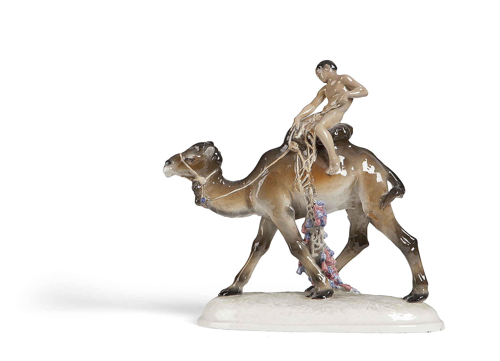 modelled as a young boy or fawn riding a camel, raised on a naturalistic oval base, printed marks