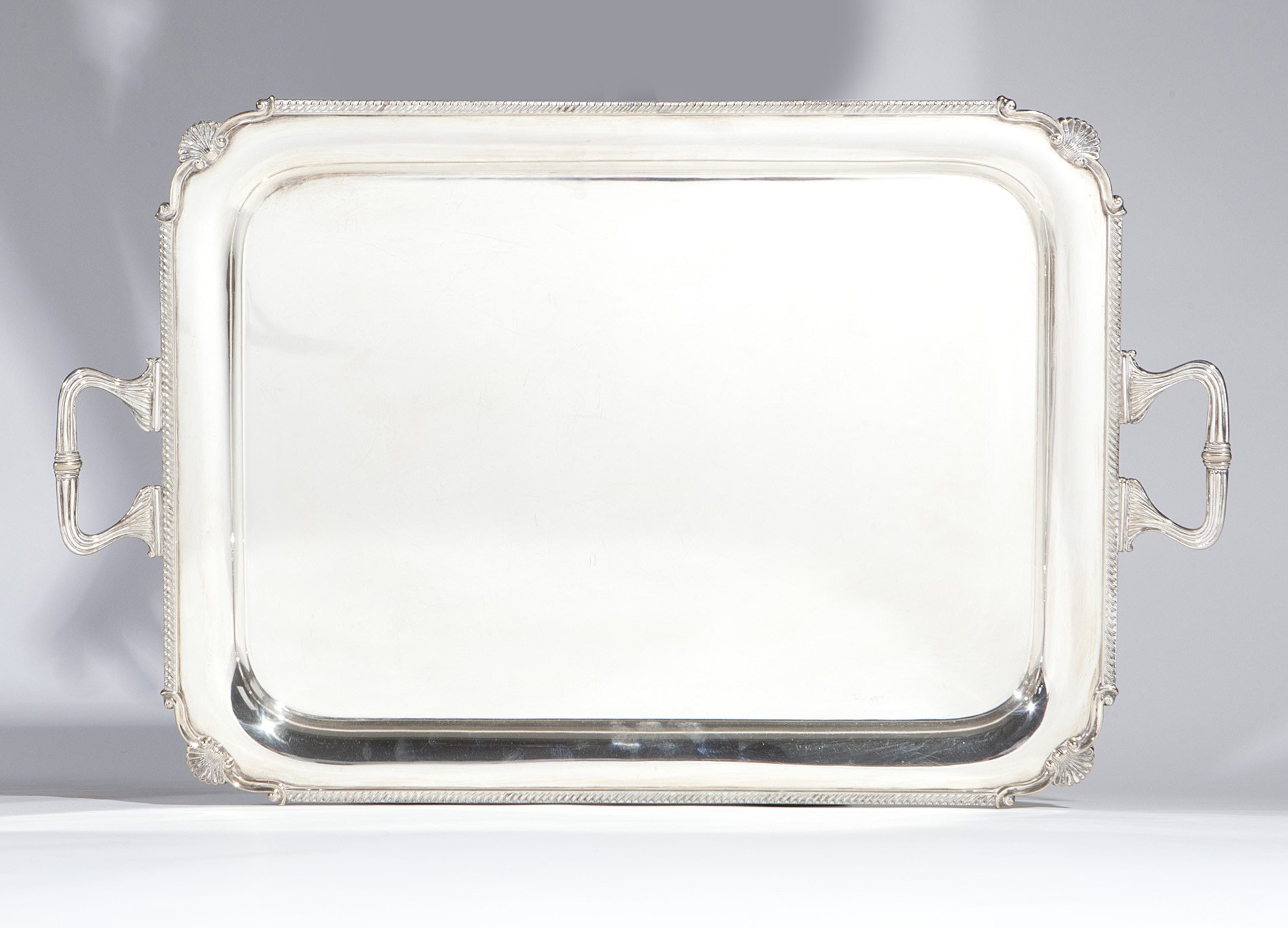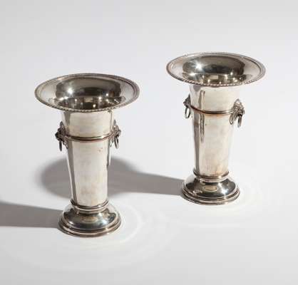 of rounded rectangular form with gadrooned border with shell cast angles, 74cm (29.1in) wide; and a PAIR OF SILVER PLATED ON COPPER VASES, each of footed trumpet form with flared and gadrooned rim above twin lion’s head ring handles, on spreading circular base, 24cm (9.4in) high (3)