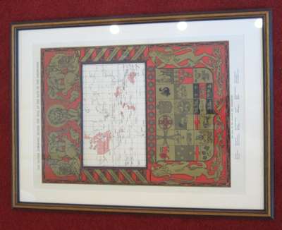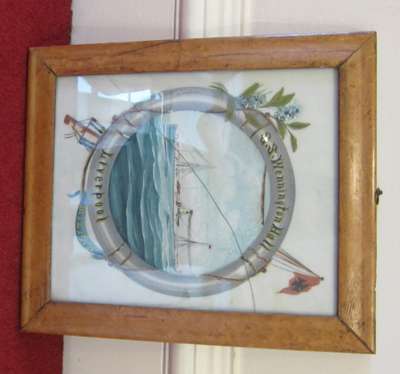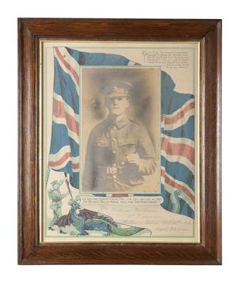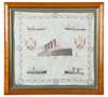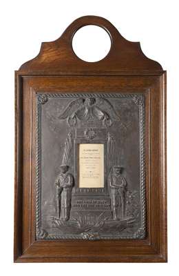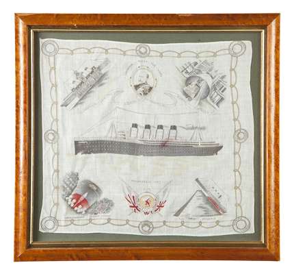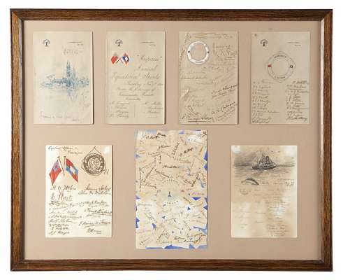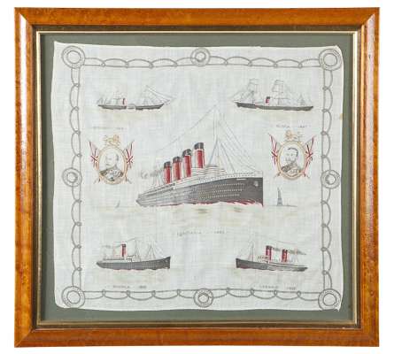 including; a bronzed ‘In memoriam’ cast plaque for Pte Charles Henry Ainsworth, within oak frame, 42 x 32cm (16.5 x 12.6in) ; a framed series of menus and other souvenirs from the Hesperus and the Harbinger, 45 x 57cm (17.7 x 22.4in); two framed printed handkerchiefs, depicting the Lusitania and the Mauretania, both dated 1907, 33 x 38cm (13 x 15in); a framed printed memorial for Pte William Williams, dated 1916, 47 x 38cm (18.5 x 15in), and two framed printed maritime textiles and another maritime print (8)
