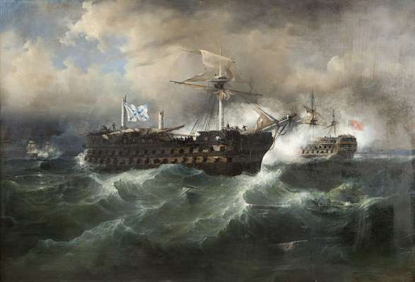 Note: This picture possibly depicts the naval Battle of Navarino was fought on 20 October 1827, during the Greek War of Independence (1821-32) in Navarino Bay (modern-day Pylos), on the west coast of the Peloponnese peninsula, in the Ionian Sea. A combined Ottoman and Egyptian armada was destroyed by a combined British, French and Russian naval force. It is notable for being the last major naval battle in history to be fought entirely with sailing ships.