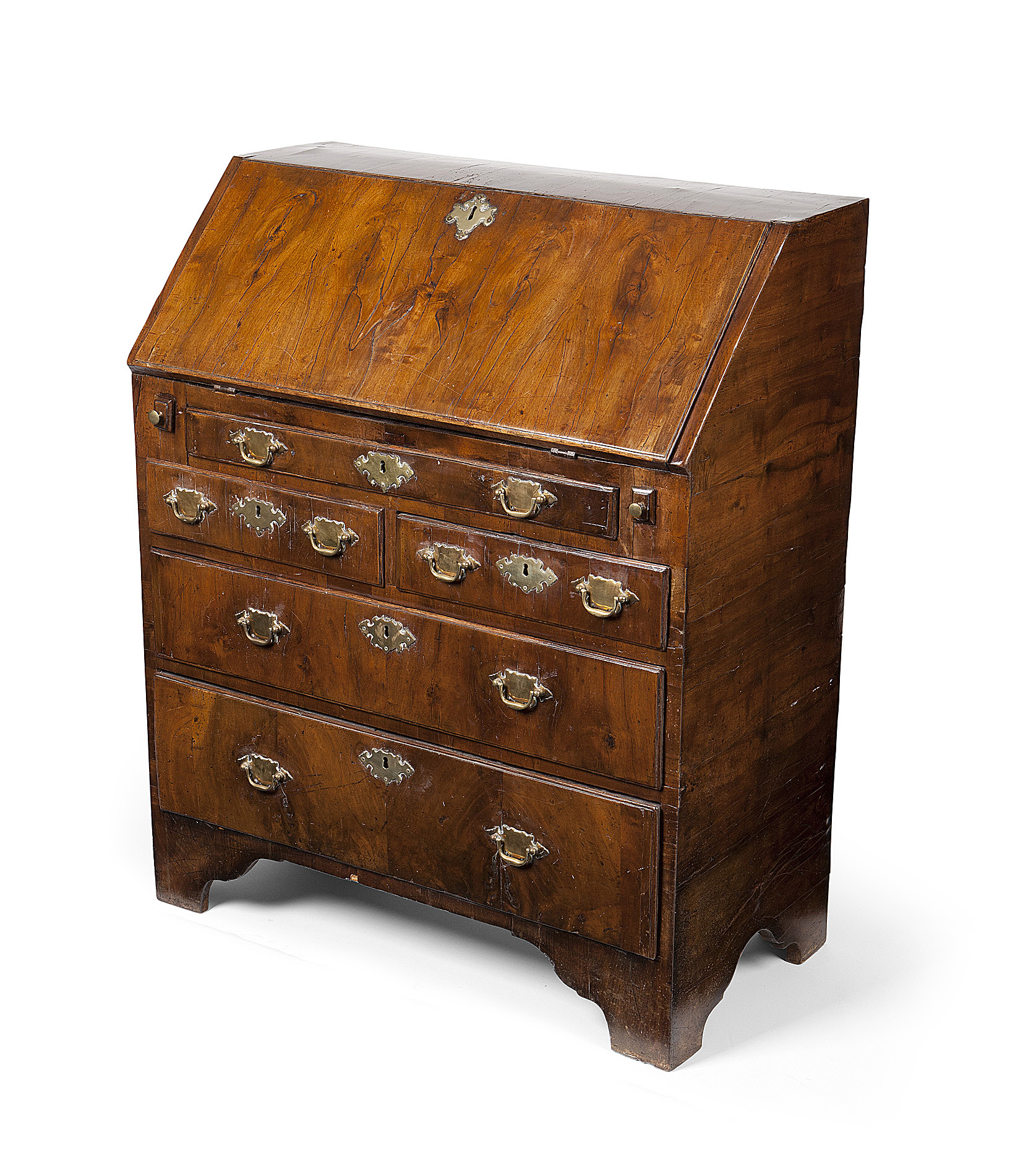 the fall front enclosing an interior fitted with nine short drawers, pigeonholes around a central cupboard with column pull outs, below an arrangement of two short and three long graduated drawers on later bracket feet
