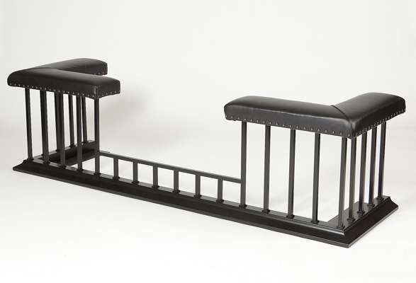 with close nailed green leather upholstery raised on square uprights on a moulded base
