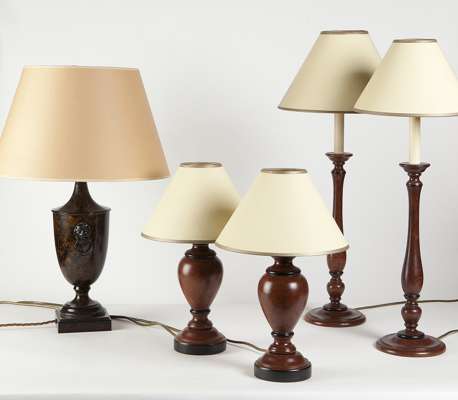 68cm (26.8in) high (including shades); together with a SIMILAR SMALLER PAIR; and a PAIR OF TÔLE PEINTE LAMPS, 57cm (22.4in) high including the shade; together with ANOTHER TABLE LAMP, wooden, 51cm (20.1in) high including shade (7)