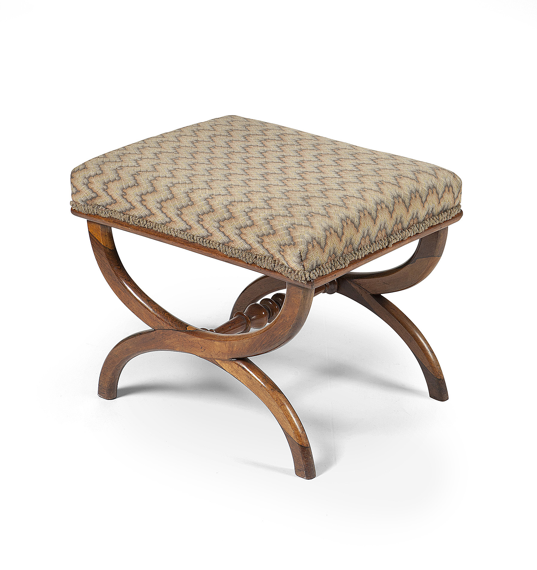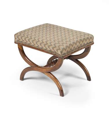 the rectangular stuff-over seat raised on shaped x-framed supports united by a pole stretcher
