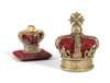 modelled as a crown resting on a velvet cushion 10cm (3.9in) high; together with a VICTORIAN NOVELTY BRASS INKWELL modelled as a crown, 17cm (6.7in) high (2)