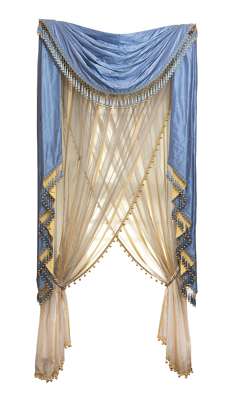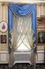 each centred with flowerhead and stiff-leaf mounts with stylised anthemion terminals, and hung with blue and yellow silk tasselled drapes and toile nets (4)