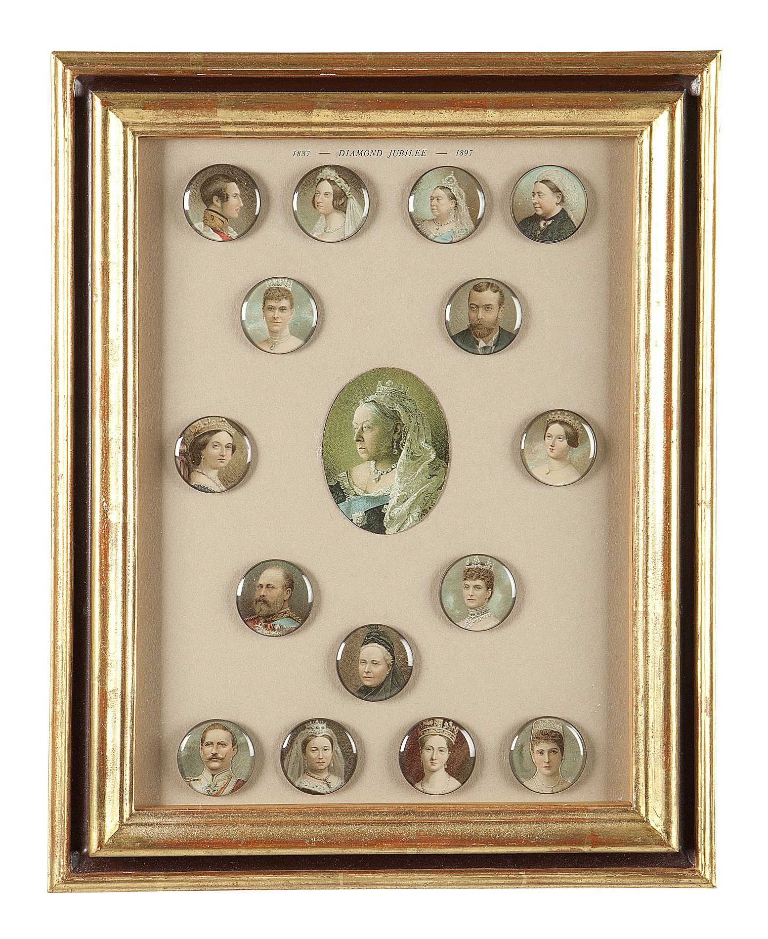 mounted on velvet and set within two frames, depicting Queen Victoria and other Royal personages (2)