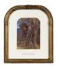 Inscribed, pencil, pen and ink, and watercolour on coloured paper, arched top