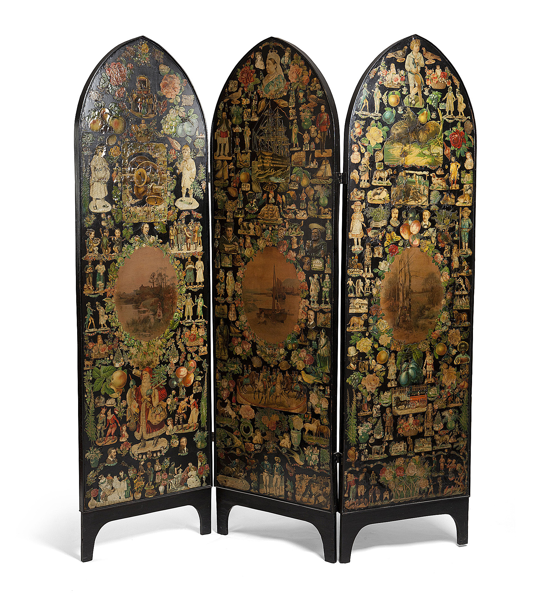 each panel with pointed arch all-over decorated in engraved and printed scraps, the reverse with embossed leather panels