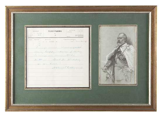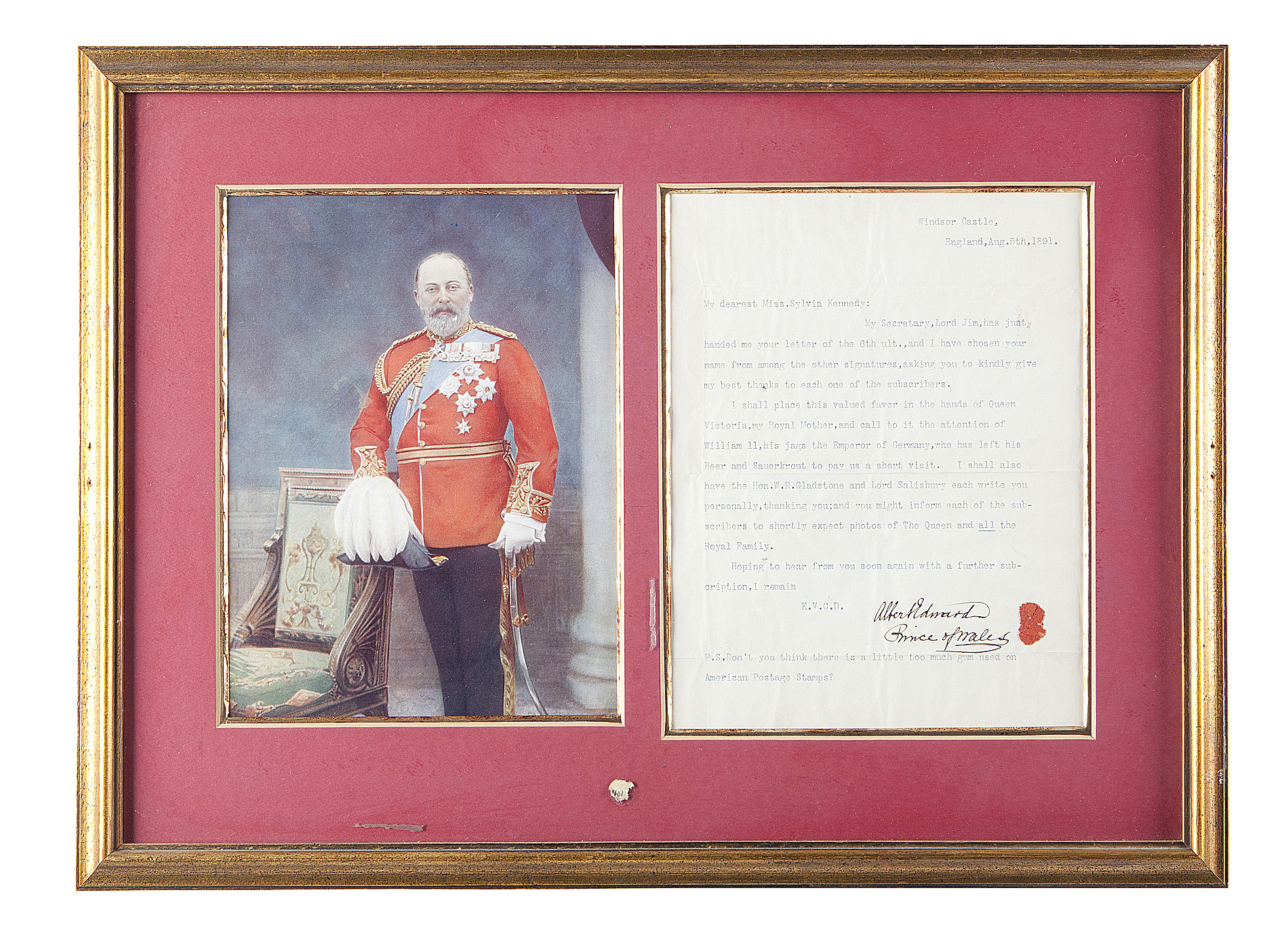 Edward VII as Prince of Wales: Telegram addressed to Princess Maud from her father, the Prince of Wales, while in Russia, sending birthday wishes, 26th November 1894; Edward VII as Prince of Wales: typed letter signed by Prince of Wales to Ms Sylvia Kennedy, dated 5th August 1891, regarding subscriptions (2)