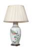 the ovoid sides finely painted with peacocks amongst brightly coloured flowers and foliage, reverse bears text panel within a black geometric border, converted to a lamp