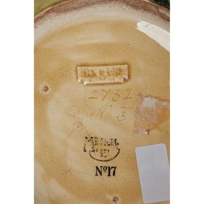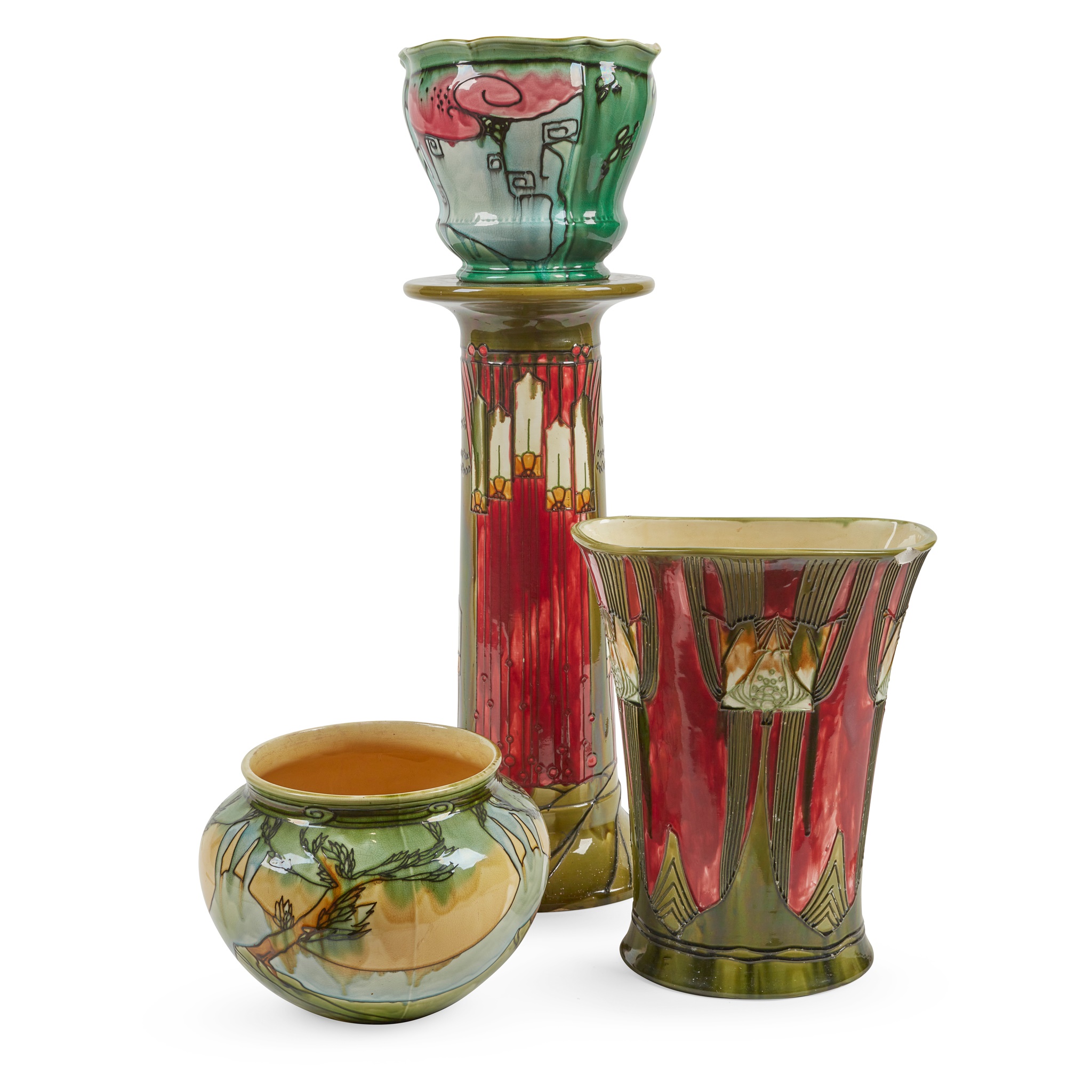 tube-lined and glazed earhenware, printed 'MINTONS LTD.' and 'No. 17', impressed 'MINTONS ENGLAND', incised '2732' and 'No. 3', indistinct date cypher, 26cm (10 1/4in) high; together with ANOTHER JARDINIÈRE, impressed 'MINTON ENGLAND' and 'MINTONS', incised '3301' and '2', 26.5cm (10 1/2in) high; and a JARDINIÈRE STAND, printed 'MINTONS LTD.' and 'No. 55', 72cm (28 3/8in) high; and an UMBRELLA STAND, printed 'MINTONS LTD.' and 'No. 72', incised '3598', with date cypher for 1920, 48.5cm (19 1/8in) high