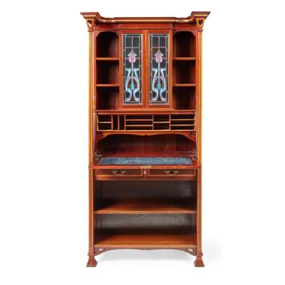 mahogany, marquetry inlay with pewter and boxwood lining, stained and leaded glass panels
