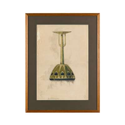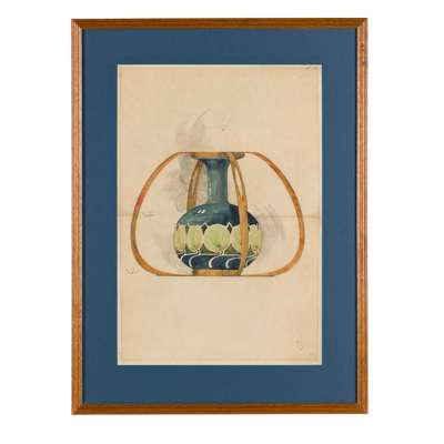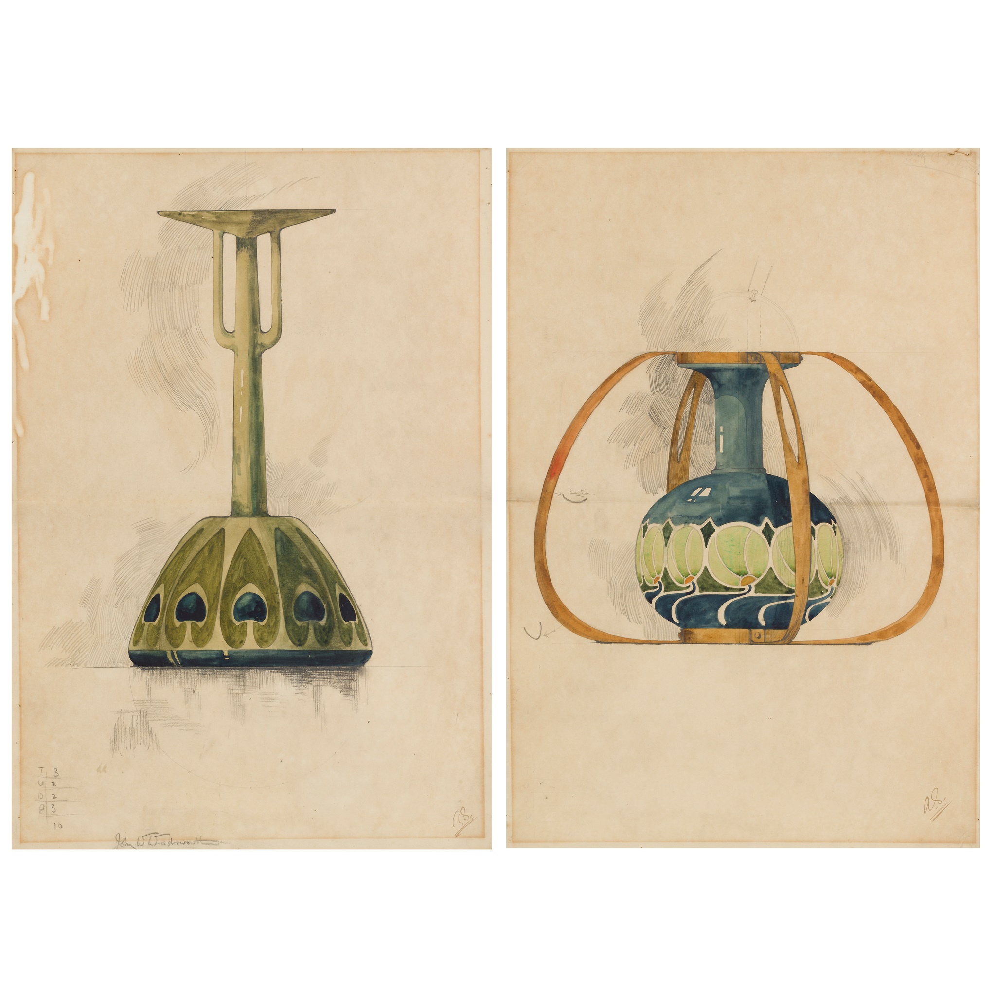 pencil and watercolour on paper, each signed 'John W Wadsworth' in pencil, and initialled 'AS' in ink (lower right), one 55cm x 38cm (21 1/2in x 15in) ; the other 55cm x 37cm (21 1/2 in x 14in); together ‘MINTON SECESSIONIST WARE’, printed trade catalogue cover, designed by Léon Solon, framed, 26cm x 17cm (10 1/4in x 6 3/4in)
