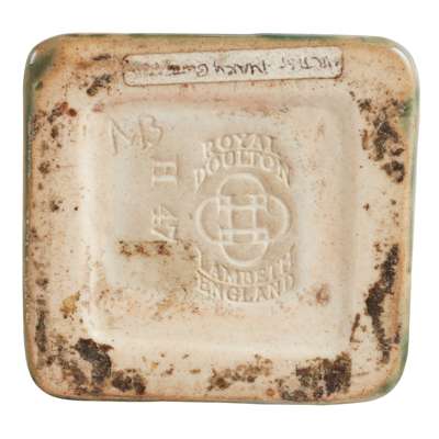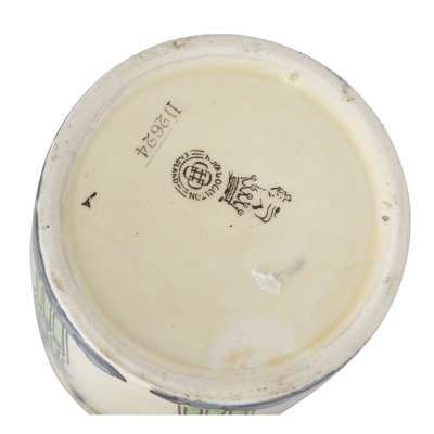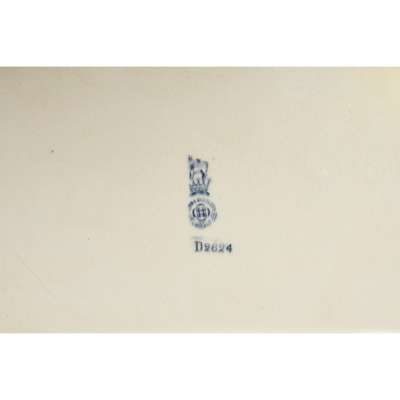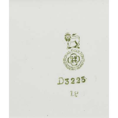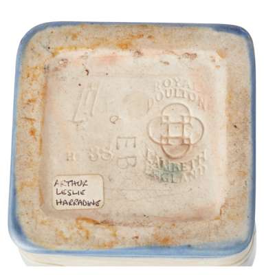 transfer-printed earthenware, printed manufacturer's mark and 'D2624', comprising a TRAY, 30cm (11 3/4in) wide; a VASE, 12.7cm (5in) high; and a BOWL, 13cm (5 1/8in) high; together with THREE ROYAL DOULTON WARES, transfer-printed earthenware, printed manufacturer's mark, including a PLATE, 26.5cm (10 3/8in) diameter; a VASE, 12.5cm (5in) high; and a TRAY, 28.5cm (11 1/4in) across; a ROYAL DOULTON VASE, glazed stoneware, impressed manufacturer's mark 14.5cm (5 3/4in) high; and TWO FURTHER ROYAL DOULTON VASES, one designed by Leslie Harradine, glazed stoneware, impressed manufacturer's marks and incised initials, each 13cm (5 1/8in) high