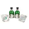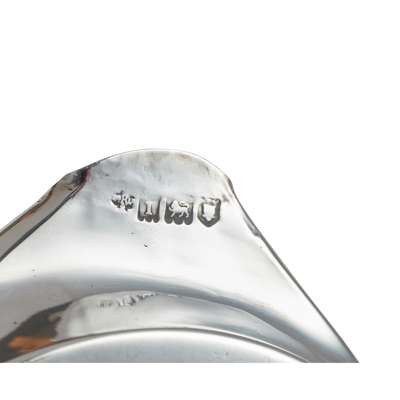 green glass with silver mounts, stamped maker's mark, one hallmarked Sheffield 1909-10, the other London 1904-05, 16cm (6 1/4in) high; together with TWO DISHES, silver and enamel, each hallmarked London, one 1904-05 and 1905-06, each inscribed 'FROM PADDY/ 1946', 10cm (3 7/8in) square