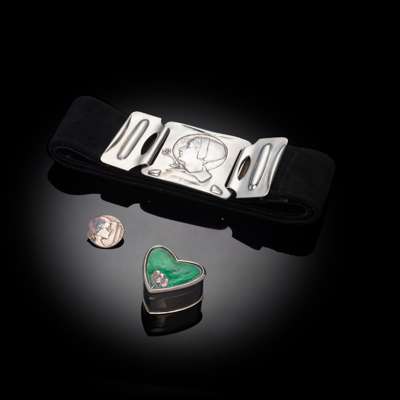 silver, and inscribed 'W. C. CONNELL / 83 CHEAPSIDE LONDON', hallmarked London 1899, with bracket fittings and later black suede belt, 11.5cm (4 1/2in) wide including the bracket fittings; together with a PILL BOX BY KATE HARRIS FOR WILLIAM HUTTON & SONS LTD., silver and enamel, stamped maker's marks, hallmarked Birmingham 1902, 4cm (1 1/2in) wide; and a BADGE BY KATE HARRIS FOR WILLIAM HUTTON & SONS LTD., silver, hallmarked Birmingham 1907 and partial registration number '4109..', 2.5cm (1in) wide