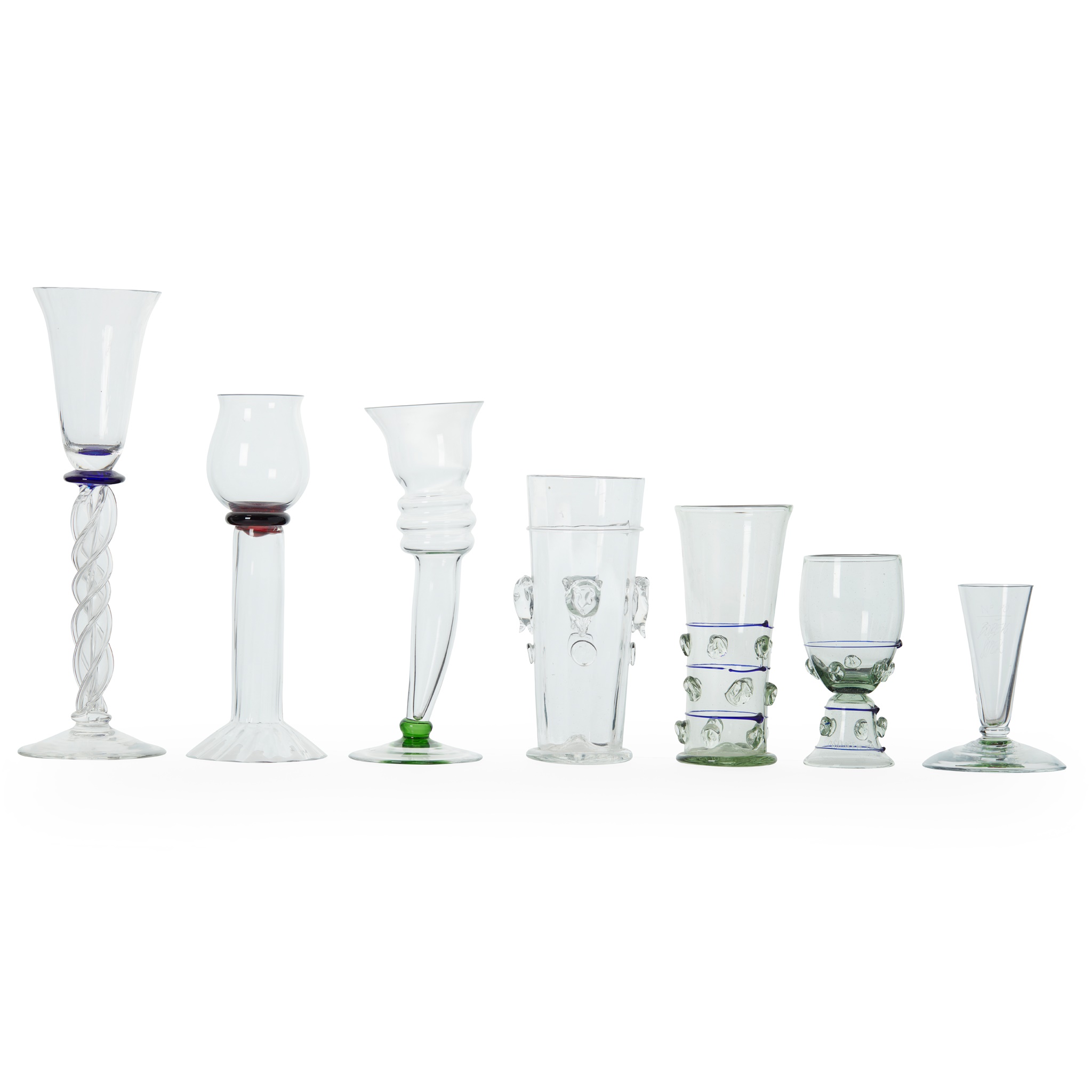 clear and applied glass, etched signature and '97', 17.8cm (7in) high; together with a FURTHER BOREK SPIEK GLASS, clear glass with applied leafy decoration, etched signature and 'NO. 80', 11.5cm (4 1/2in) high; a MATCHING VESSEL AND WINE GLASS, green glass with applied prunts and trailing decoration, each etched 'HAARLEM 750/ 750/120', 16.3cm (6 3/8in) high and 13.4cm (5 1/4in) high; and THREE TALL VESSELS/GLASSES, clear and coloured glass, 29.3cm (11 1/2in) high, 22.5cm (8 7/8in) high and 23.2cm (9 1/8in) high