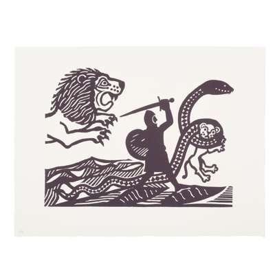 First edition, deluxe issue, one of 55 copies (of which 50 for sale), oblong quarto, original quarter morocco, colour illustrations throughout. With 12 linocuts by Edward Bawden depicting scenes from Morte d'Arthur, printed by Bawden's son Richard Bawden from Edward's original linocuts on a single sheet of thick wove paper, and with manuscript limitation on verso, the linocuts in grey card chemise as issued and housed together with the book in original blue cloth solander box