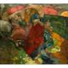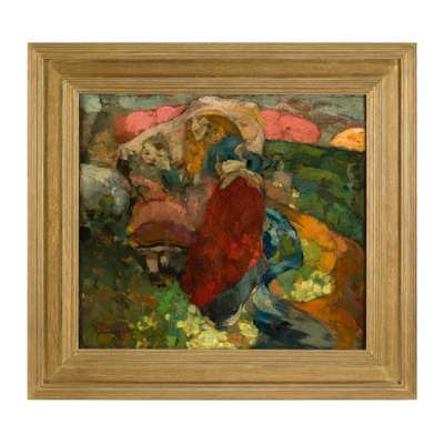 Hornel's biographer, Bill Smith, has argued that this painting appears to confirm that Hornel had 'heard about, if not seen' the work of Paul Gauguin (1843-1903). (op.cit., p.68) He explains: 'In style it is very similar to the work being done by Gauguin and [Emile] Bernard at this time. It is a rather expressive painting. The pigment is very freely handled, the rich colour applied both in broad flowing brushstrokes and in small patches. In several areas Hornel has given the surface a textured appearance. The pose of the woman and the little girl standing on the treeless hillside, bound together in the blustery wind by the long white shawl-like material billowing over their heads, the dark meandering stream, the winding path and the curve of the horizon all combine to give the painting a wonderful flowing rhythm. The drama is heightened by the appearance of the moon just above the horizon and the pink glow of the sunset reflected in the clouds.'