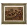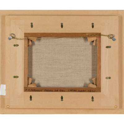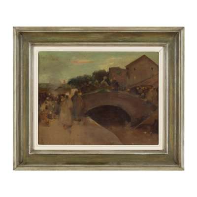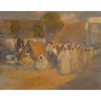 Painted on an easily portable canvas measuring 10 x 13 inches, Fishing Boat, Morocco reveals an example of the bustling scenes which caught Fergusson’s eye during his explorations. His enjoyment of the application of oil paint is clear in the freely executed brushstrokes. A skilful use of highlights, especially of bright red, is combined with a muted palette in which tonal values are explored and hints at the colourist he would become.