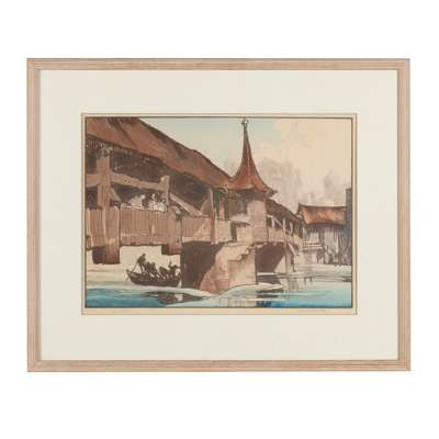 and another, 'The Bridge at Lucerne,' colour woodblock, No. 28, signed in pencil to margin by both artists and numbered