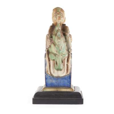 Note: During the 1930s, Gilbert Bayes worked on a community art project for the St. Pancras Housing Association Improvement Society as part of a slum clearance scheme at Sidney Street in Somerstown, north of Euston station, and at other sites across London. The aim was the provision of high-quality homes for the poorest tenants. The society’s architect was Ian B. M. Hamilton, and he designed all the new flats to stand on the cleared land. Since Bayes believed that art should be available to all people, this commission was very close to his heart. He produced relief model lunettes of fairy tale characters, as well as ceramic sculptures and post finials for the washing line posts. The finials were inspired by animals and plants, nursery rhymes, Christmas cards, or the lives of the saints.