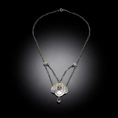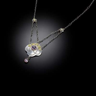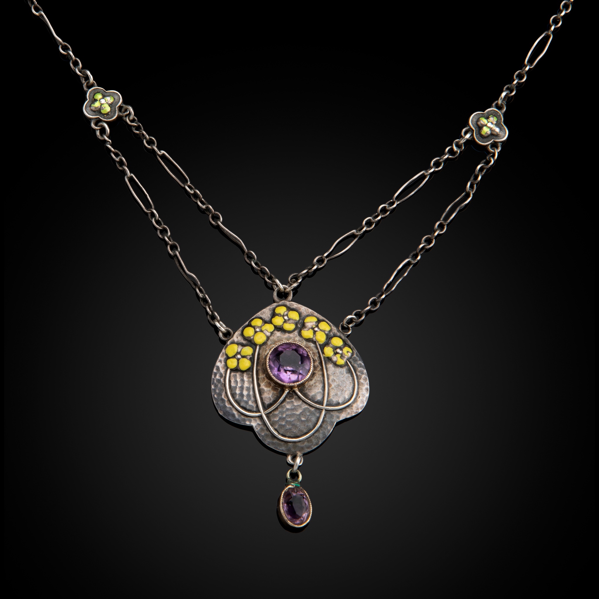 partially stamped '950' and 'MBC', set with facetted amethysts and yellow enamel
