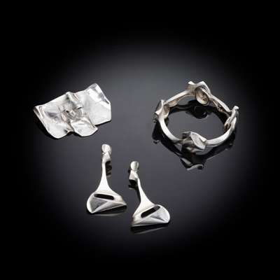 silver, stamped '925' and 'LAPPONIA', 18cm (7in) long; together with a PAIR OF EARRINGS BY BJÖRN WECKSTRÖM FOR LAPPONIA, silver, stamped '925', 'BJORN' and 'STERLING / FINLAND / LAPPONIA' and with import marks for London, 6.3cm (2 1/2in) long; and a BROOCH/ PENDANT BY EMILE SOUPLY (BELGIAN 1933-2013), silver, stamped 'A925', 'Souply' and '15', 6.5cm (2 1/2in) wide