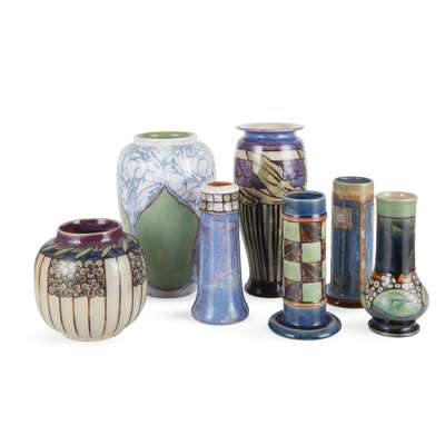 glazed stoneware, impressed manufacturer's marks, incised initials, 25.5cm (10in) high; together with a BESSIE NEWBURY VASE, glazed stoneware, impressed manufacturer's mark, incised initials, 14.5cm (5 3/4in) high; and FIVE FURTHER ROYAL DOULTON VASES, glazed stoneware, each with impressed manufacturer's mark, 26.5cm (10 1/2 in) high; 19.5cm (7 3/4in) high; three measuring 18.5cm 7 (3/8in) high; and 19cm (7 1/2in) high